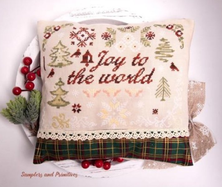 Joy To The World is the title of this cross stitch pattern from Samplers and Primitives that is shown finished as a small pillow but it could be an ornament or flat fold finish.