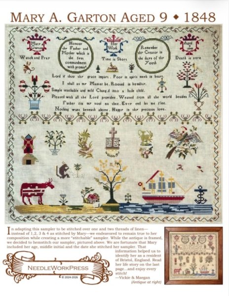 Pre-Order! This item will be released during the Nashville Wholesale Market and will ship by mid to late March. Please order those items you need sooner separately from this item. Mary A Garton Aged Nine 1848 is the title of this cross stitch pattern from Needle WorKPress.