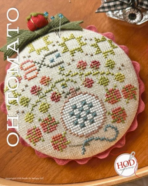 Oh Tomato is the title of this cross stitch pattern from Hands On Design that offers two designs. The Sampler (67 x 247) is charted for the verses to be stitched over one or over two. The pinwheel (53 x 57) uses Lady Dot Creates trim (Country Rust Ric Rac).